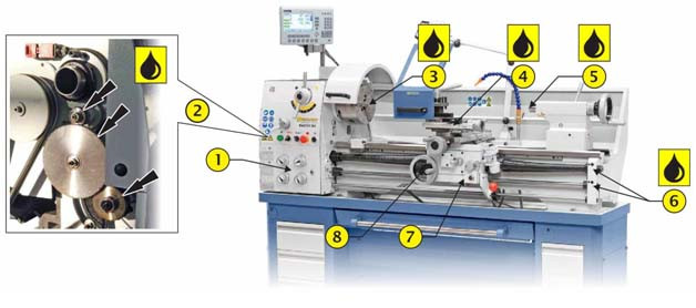 - Задня бабка (2 точки змащення) один раз на зміну оливі Slideway Oil CGLP 68